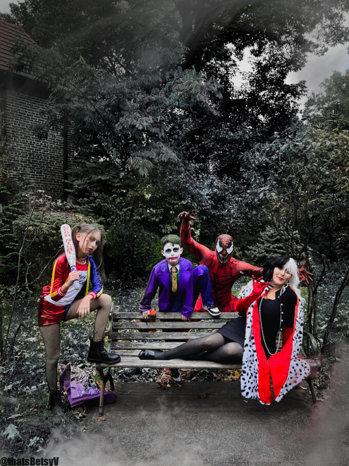This year, because we’re all about embracing our dark side (and also because my daughter insisted), we went as a gang of villains. I, personally, channeled my inner Cruella, Ziana was Harley Quinn, my son was loving his Joker character and Boytoy was Carnage.