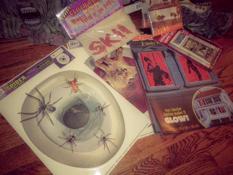 My absolute favorite decoration during Halloween, “Bloody Window Magic Decorations” (http://www.shindigz.com/party/bloody-window-magic-decorations/pgp/11szhwnbwm). I bought these last year and the neighbors loved it! At night it glows which makes it scary as f*#k! Make sure to take measurements of where you plan on placing them so they fit well.