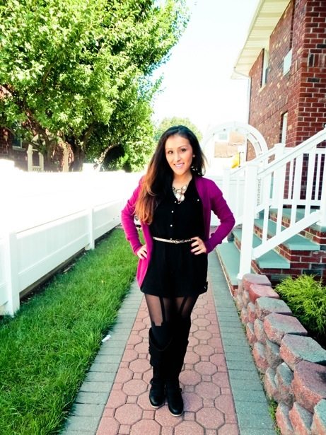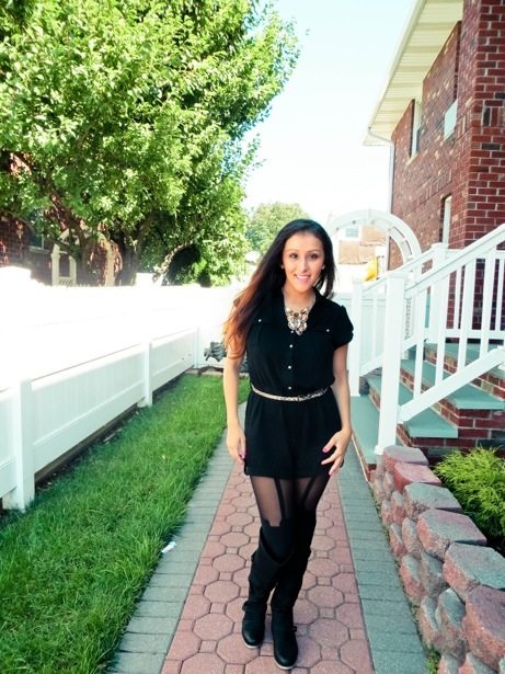 I took my Summer romper (that I’ve had for years) wore it with my House of Holland pantyhose, belted with a cheetah belt (Forever 21) wore a cardigan, topped with a statement necklace (Forever 21), and my over the knee boots by my favorite brand Carlos By Carlos.