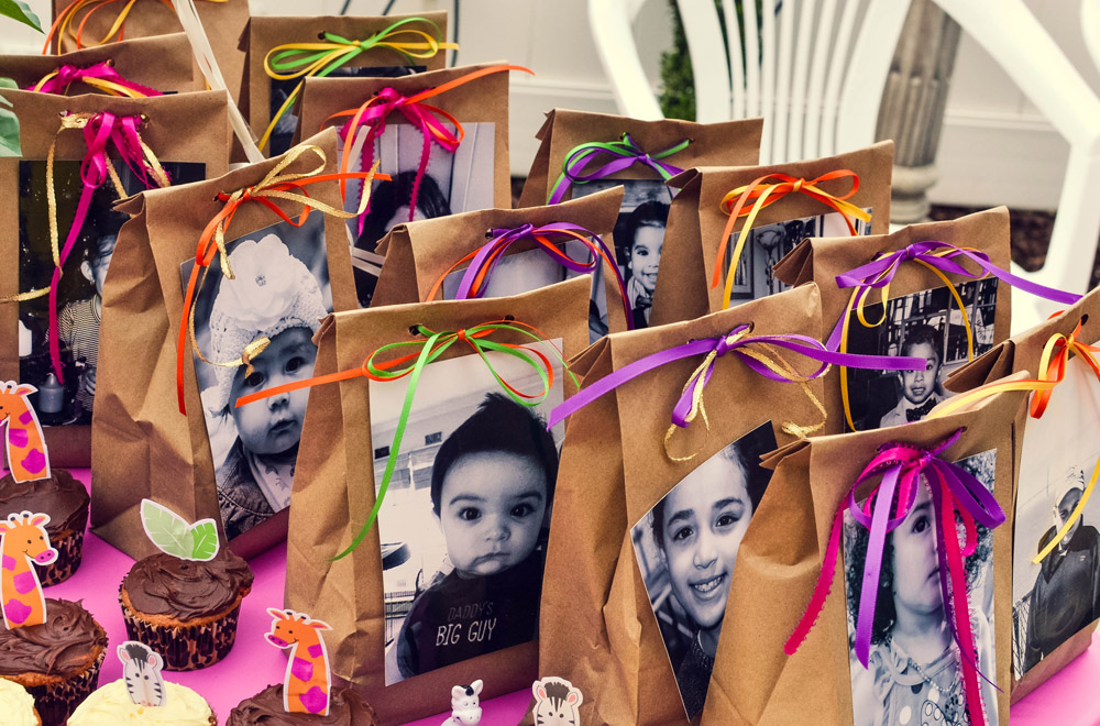 The gift bags were my favorite and everyone’s! I had bought the brown paper bags at where else then the 99cent store and knew I wanted to use them in some way. I took to Pintrest and searched “brown paper bags.” A whole bunch of stuff popped up and I basically put two different ideas together! I took photos from Facebook, went to lightroom changed the photos to black and white and printed them out at Walgreens.